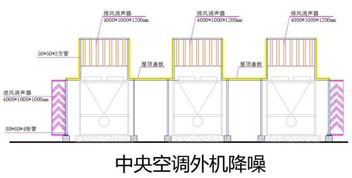 1、空調(diào)風(fēng)機出口處安裝復(fù)合式消聲設(shè)備,消耗風(fēng)機空氣動力性噪聲能量;安裝環(huán)境允許情況下也可在空調(diào)機外側(cè)安裝隔聲屏障,為周圍住宅營造聲影保護區(qū)域。