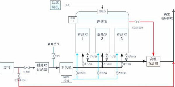 有機(jī)廢氣通過(guò)風(fēng)機(jī)輸入蓄熱室進(jìn)行升溫,吸收儲(chǔ)存的熱量,隨后進(jìn)入焚燒室進(jìn)行燃燒,在燃燒的過(guò)程中,有機(jī)廢氣被分解成二氧化碳和水。而且,有機(jī)廢氣在燃燒的時(shí)候,所釋放的能量,還可以被蓄熱室里的廢氣利用,達(dá)到節(jié)能的目的。