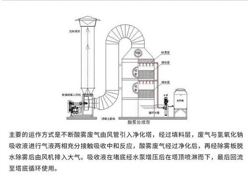 排除的酸霧廢氣→進入風管→經過酸堿廢氣處理塔→風機→風管→達標排放。